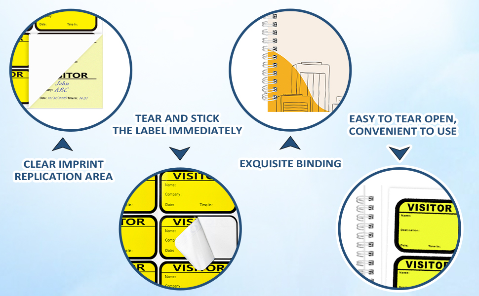 Privacy-Protected Record Keeping and Memo Pages – Each page of the sticker set includes a memo page to record detailed guest information and maintain a guest log.Every visitor pass sticker generates a carbon copy stored in the registry log book for accurate records. Divider sheets block previous entries, protecting confidentiality and complying with privacy policies—ideal for visitor tracking systems in schools, hospitals, and corporate offices.