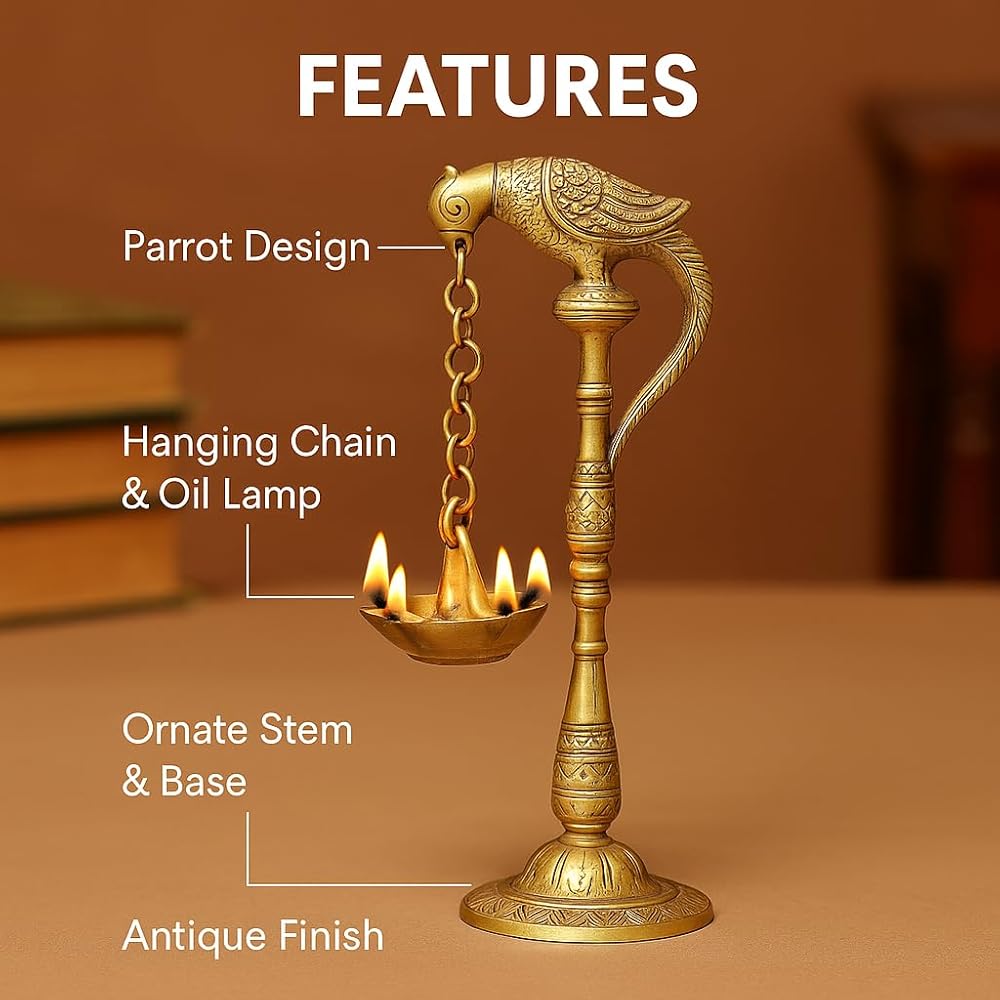 LoveNspire 2 PC Parrot Brass Oil Diya Kerala Samai Puja Diya Traditional 7.5 Inches Bird Pair Hanging Chain Oil Lamp Hindu Religious Kathu Vilakku Deepak for Home Temple Diwali Decor Housewarming Gift