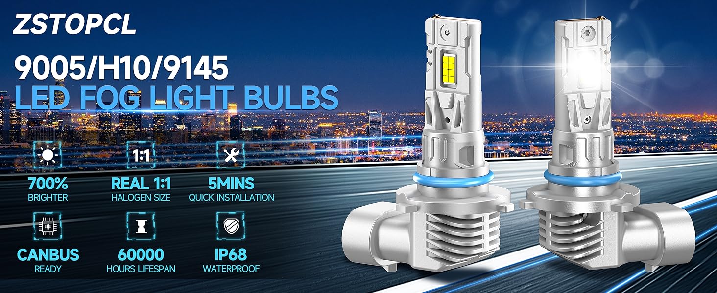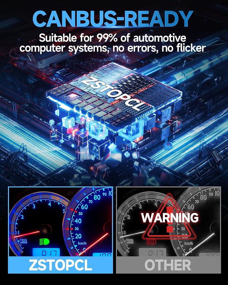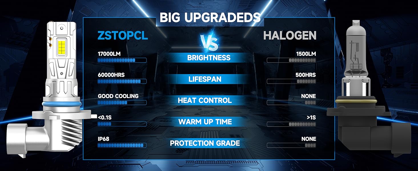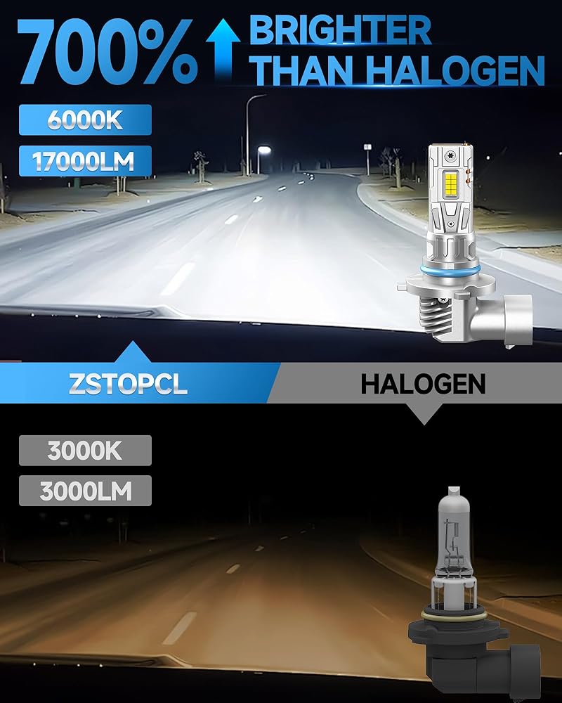 【Upgraded 700% Brightness】ZSTOPCL latest 6000K cool white light bulb adopts a double-sided 16pcs CSP Chips design, with a full light pattern and no black spots. It can up to 17000LM, which is 700% brighter than the original car halogen lamp, making your night driving vision clearer and enjoying the fun of night driving