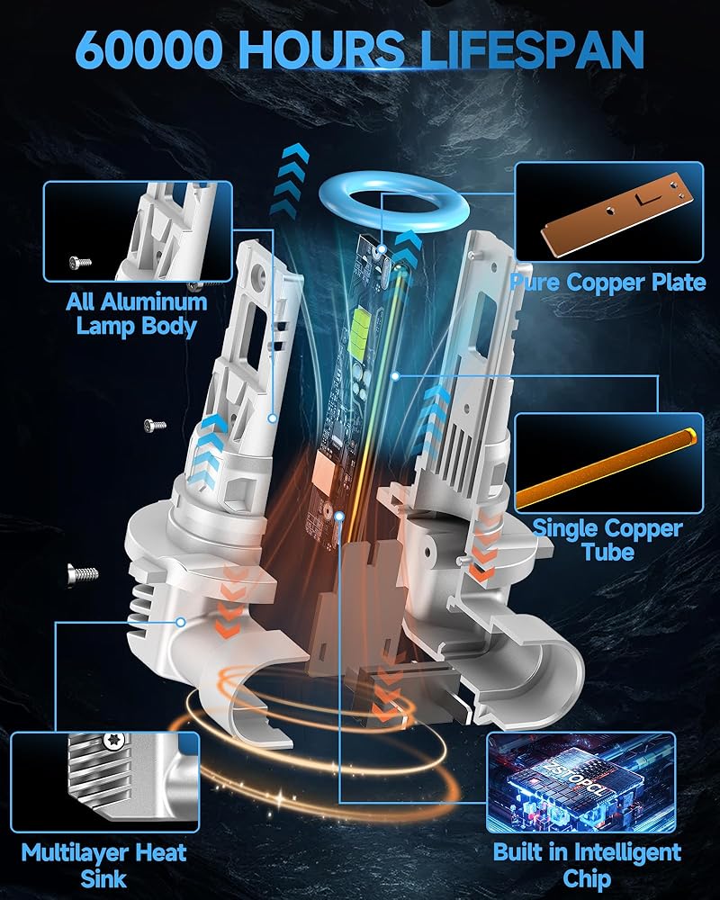 【60000+ Hours Lifespan】The bulb adopts an all aluminum alloy shell design, combined with copper pipes and a 15000RMP high-speed silent fan, which quickly reduces the temperature of the lamp body and effectively extends the bulb life to more than 60000 hours