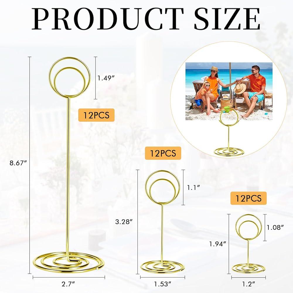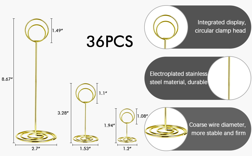 3 Versatile Sizes: Includes 12 pieces each of 1.94 inch, 3.28 inch and 8.67 inch, round gold card holders. Perfect for displaying table numbers, photos, memos, or food labels at weddings, parties, or office events