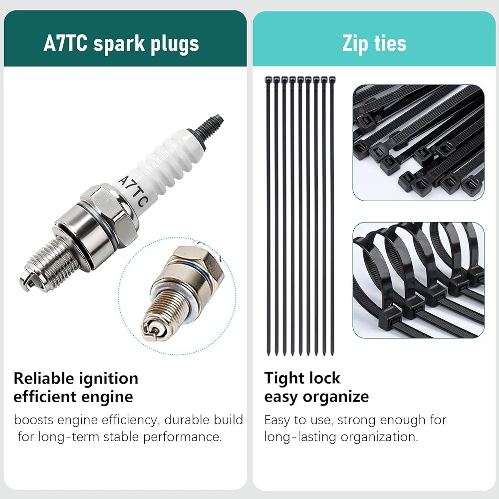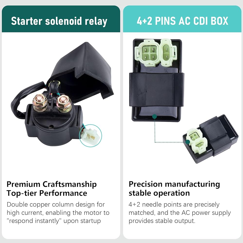 Complete GY6 Ignition System: Includes 1 × 4+2 pins AC CDI box, 1 × starter solenoid relay, 1 × 50cc ignition coil, 1 × 4-pin voltage regulator rectifier, 2 × A7TC spark plugs, and 10 × zip ties.