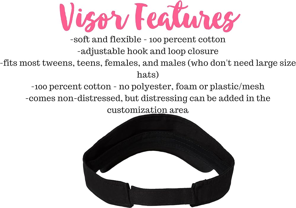 Custom, fully embroidered palm tree visor is sewn in the US by our small handmade company. Choose visor color and thread colors. Visor is 100 percent cotton, flexible and soft. All visors come non-distressed, but hand distressing to the bill edges can be added in the customization area. Adjustable, hook and loop closure back will accomodate most teen through adult customers regardless of gender. Not recommended for males who need large size/specialty size caps.