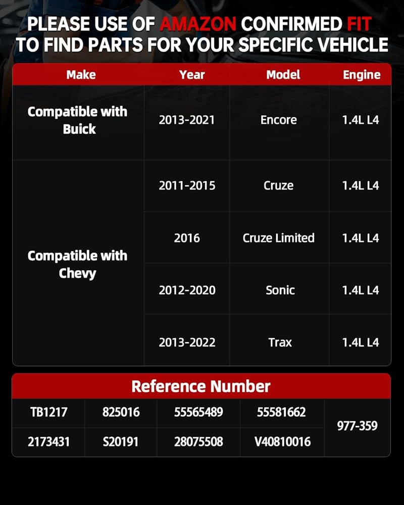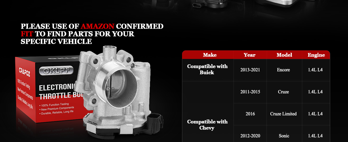 Compatible vehicle models2:The electronic throttle body Compatible with Chevy Cruze 2011-2015 1.4L L4 Cruze Limited 2016 1.4L L4 Sonic 2012-2020 1.4L L4 Trax 2013-2022 1.4L L4