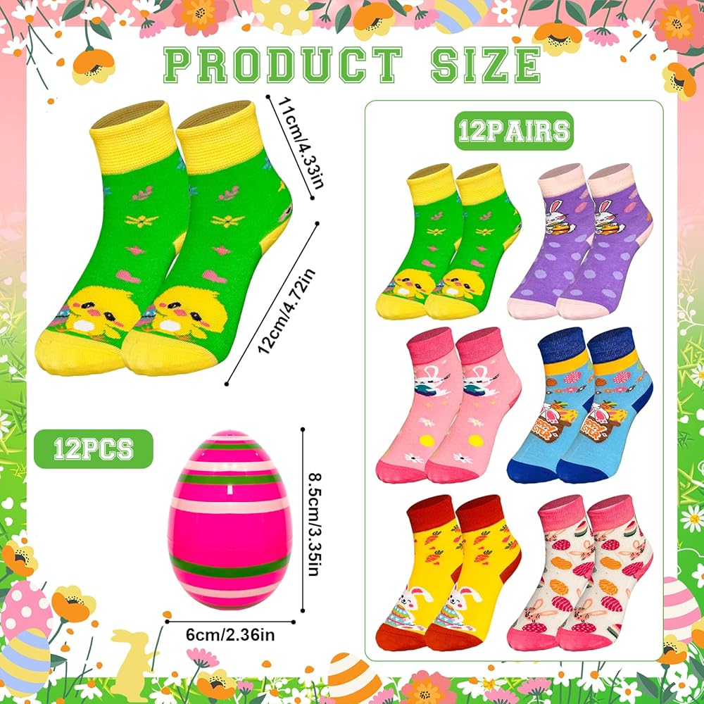 Easter Egg Socks: You will receive 12 pairs of Easter socks with 2 styles and ample quantity, we guarantee to meet your wardrobe needs; a variety of designs and vibrant colors are available and 12 Easter eggs, a sufficient quantity for you to give the socks as egg fillers to family or friends during Easter, sharing a joyful and happy holiday