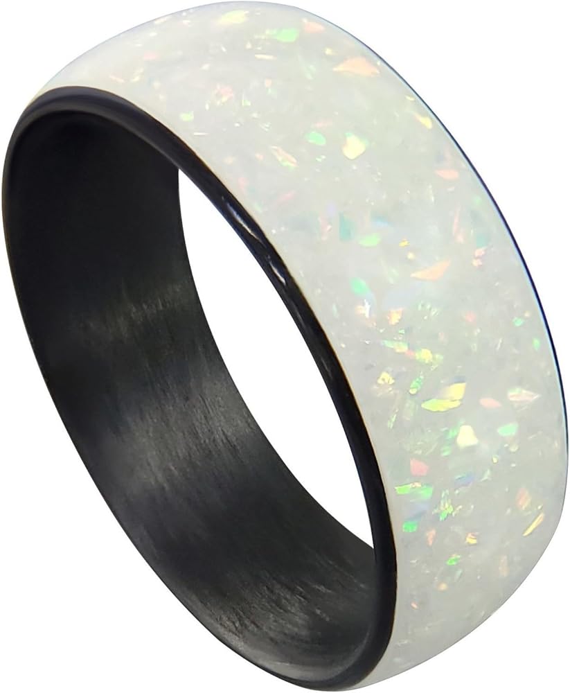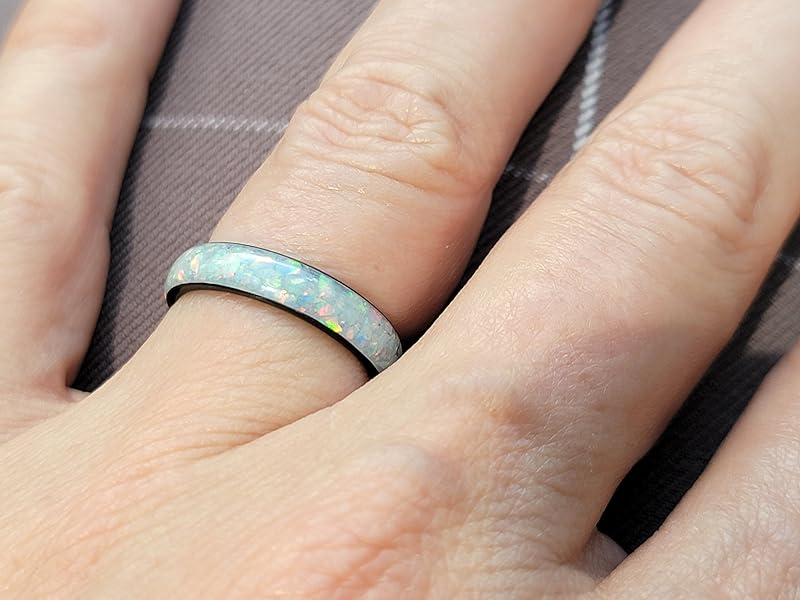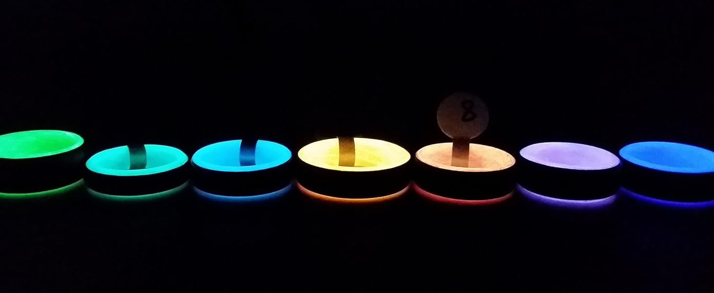 Glow - We use a Non-toxic strontium aluminate infused in our resin for the glow. Glow times vary depending on charge time and sunlight exposure/UV exposure. When charged with UV light for 5 to 10 seconds, the ring will glow strong for a couple of minutes then the glow will dim for one to four hours. It is necessary to be in a dark or dimly lit space to see the full affect of the glow. The ring can be recharged for 10+ years.