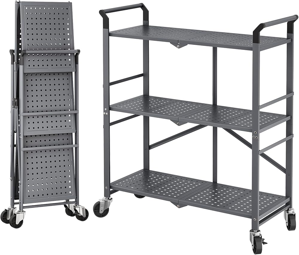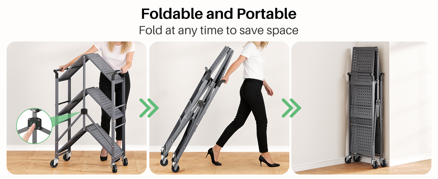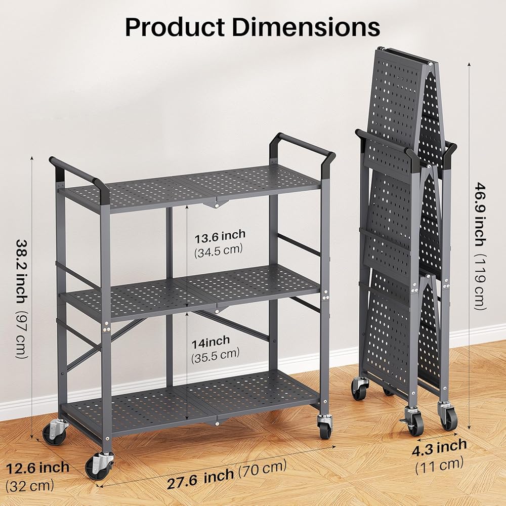 قابلة للطي والحمل: عربة التسوق ذات الثلاث طبقات سهلة الطي والتخزين، ويمكن طيها إلى حجم صغير في ثوانٍ حتى يمكن وضعها بشكل أنيق في الزاوية عند عدم الاستخدام. مثالية للمساحات الصغيرة والنقل السهل، تعمل هذه العربة متعددة الاستخدامات بشكل مثالي في الداخل أو الخارج في المطابخ والمكاتب والمطاعم والمستودعات والجراجات ودور الحضانة والمدارس والمزيد.