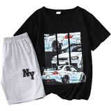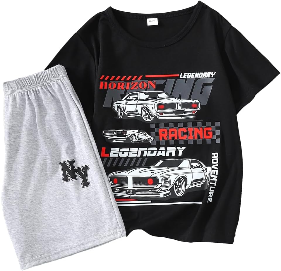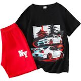 【DESIGN】Kid boys clothes outfits paired with Simple Car Print T-Shirt & Letter Print Shorts set, Great for vacation and travel in spring and summer.