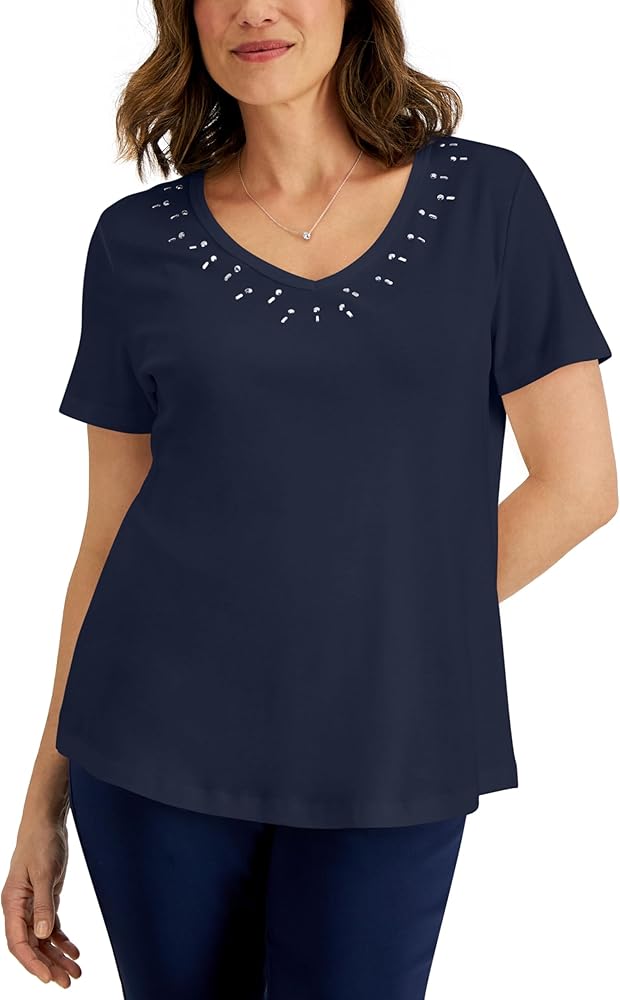 Karen S takes your go-to collection up a notch with gleaming studs on this easy-to-wear top. Due to generous sizing, we suggest sizing down for the perfect fit Studded scoop neckline Relaxed fit; approx. 27" long All cotton Machine washable Imported Web ID: 13643066