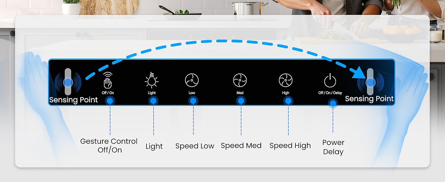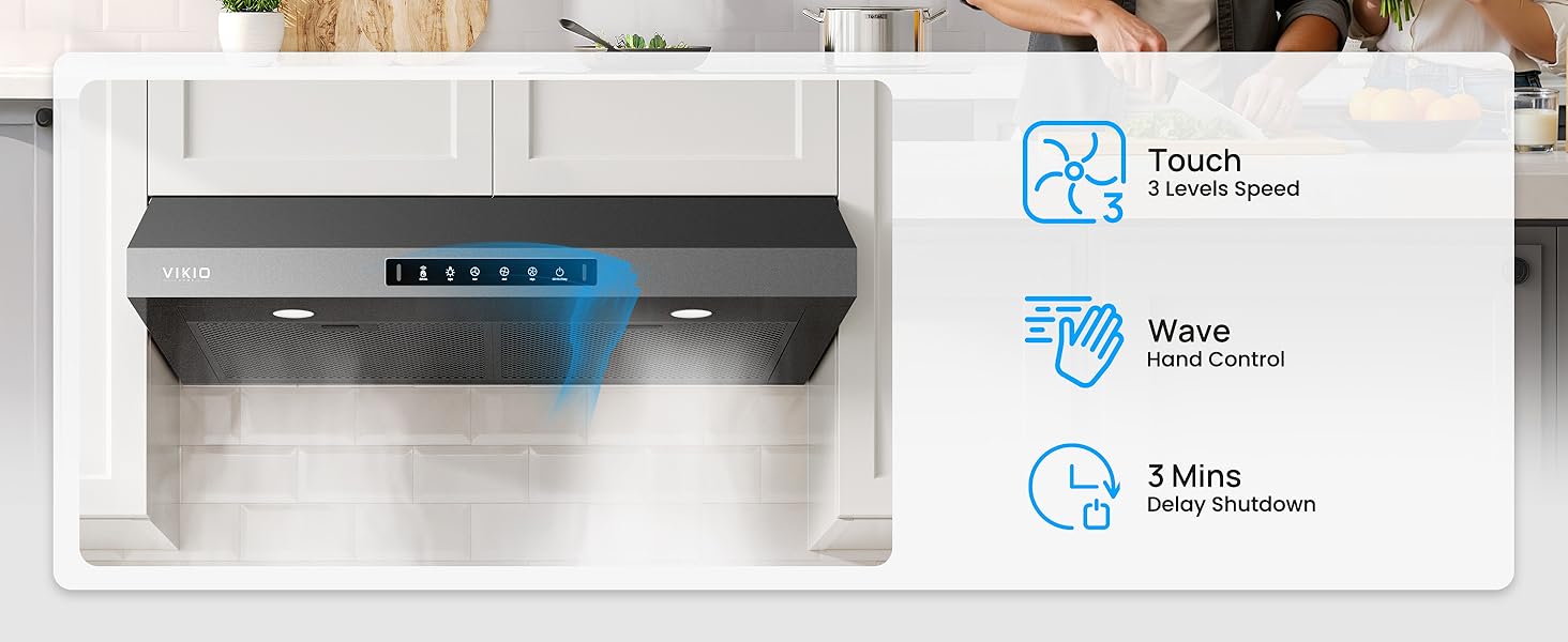 【Wave Control, No Touch, No Smudge】 This stove hood with responsive gesture control or a touch panel. Features high-precision detection, 3 adjustable fan speeds, and a memory function that retains your last setting. This kitchen vent hood offers you flexible and hygienic control options.