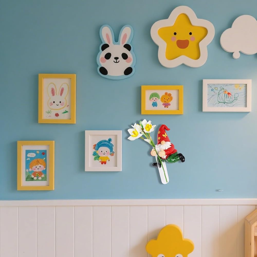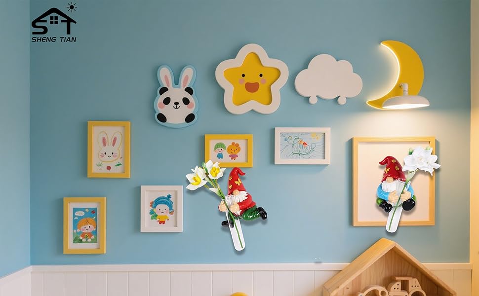 Tool-Free Installation: Quick to Refresh Your Space No drills or complex tools required! The lightweight resin gnome statue features a built-in hanging hole for swift wall mounting. Sturdy enough to hold the 5.91in(15cm) glass wall mounted flower vase (plus plants), yet easy to reposition—so you can switch up your wall art decor anytime. In just minutes, turn blank walls into whimsical displays with this perfectly sized piece.