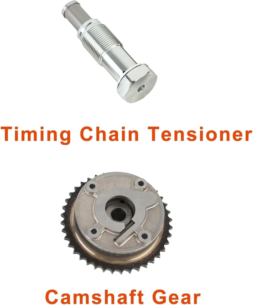 Package Content: 1x timing chain, 1x chain tensioner, 1x camshaft gear, 1x crankshaft gear (sprocket), 3x timing chain guide, 1x VVT gear with bolt