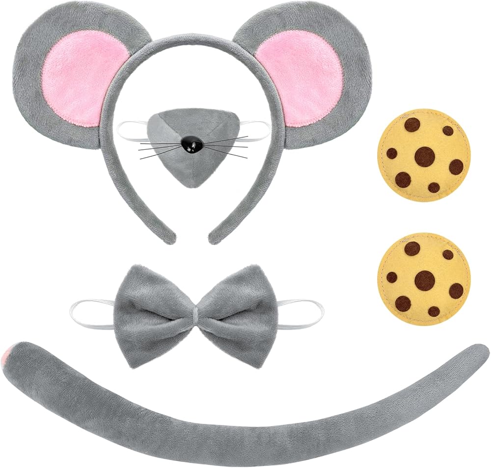 Complete Mouse Ears Costume Package: Includes 1 gray old mouse ear headband, 1 bow tie, 1 flexible mouse tail, 1 nose cover, and 2 cookie brooches—everything to create a full mouse look instantly.