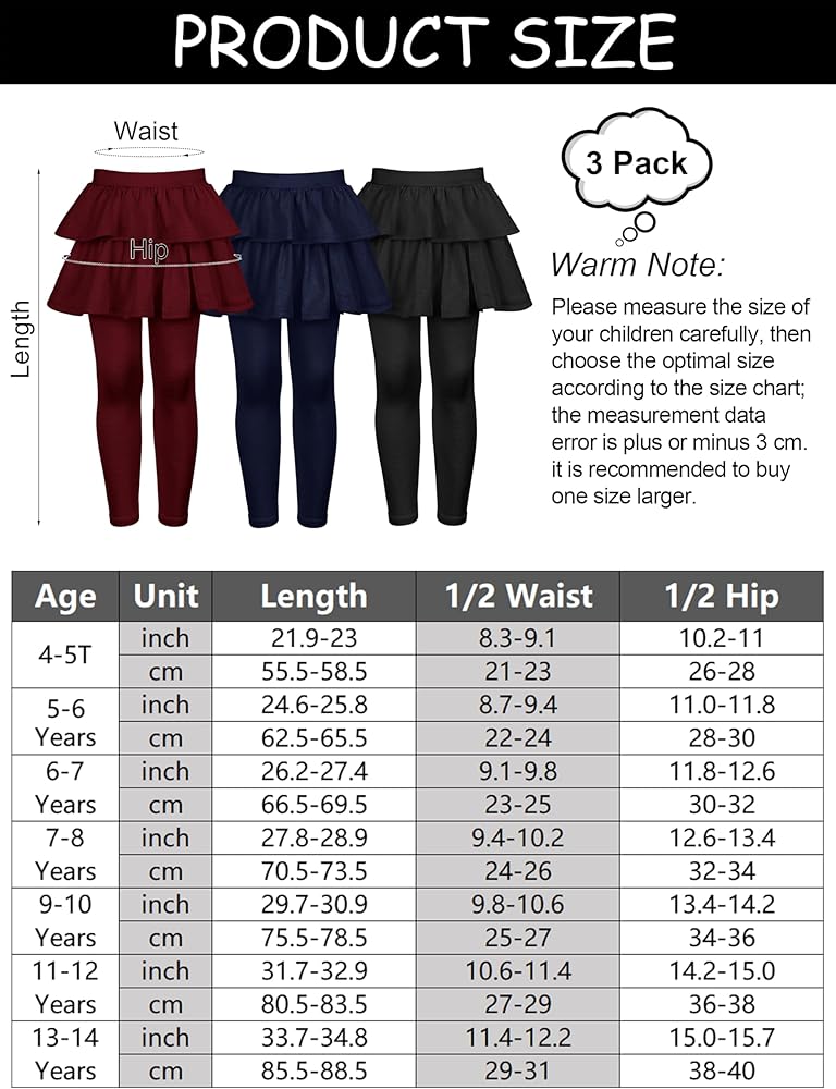 Various sizes: we provide you with girls footless leggings with ruffle skirts in 5 different sizes, pleasure measure your size carefully, then choose the optimal size according to the size chart, please note that there might be slight differences due to manual measurements