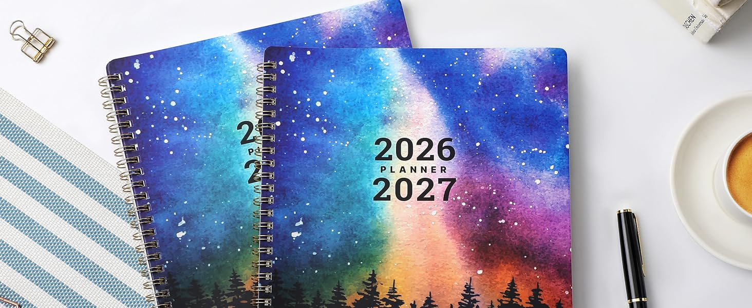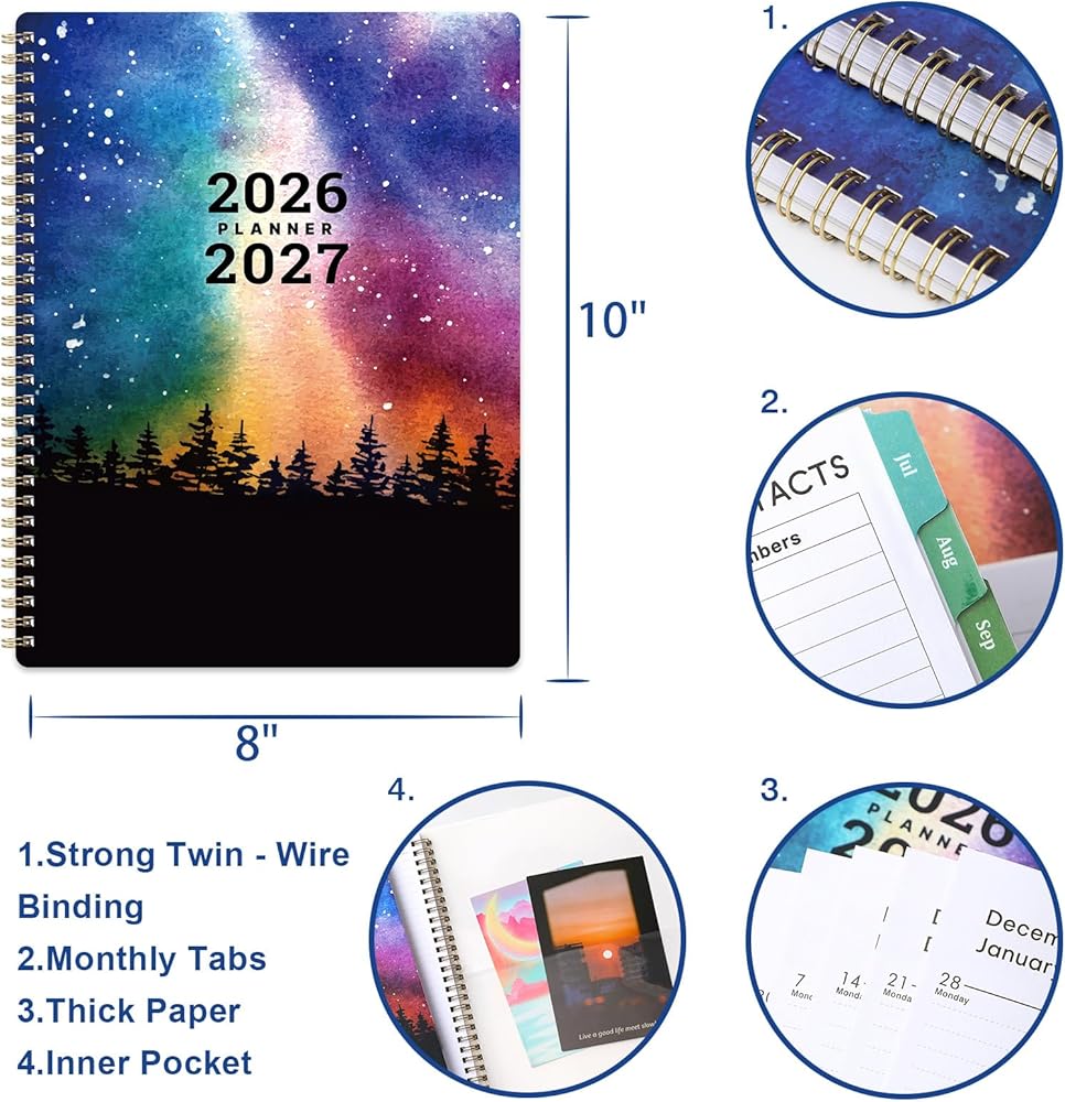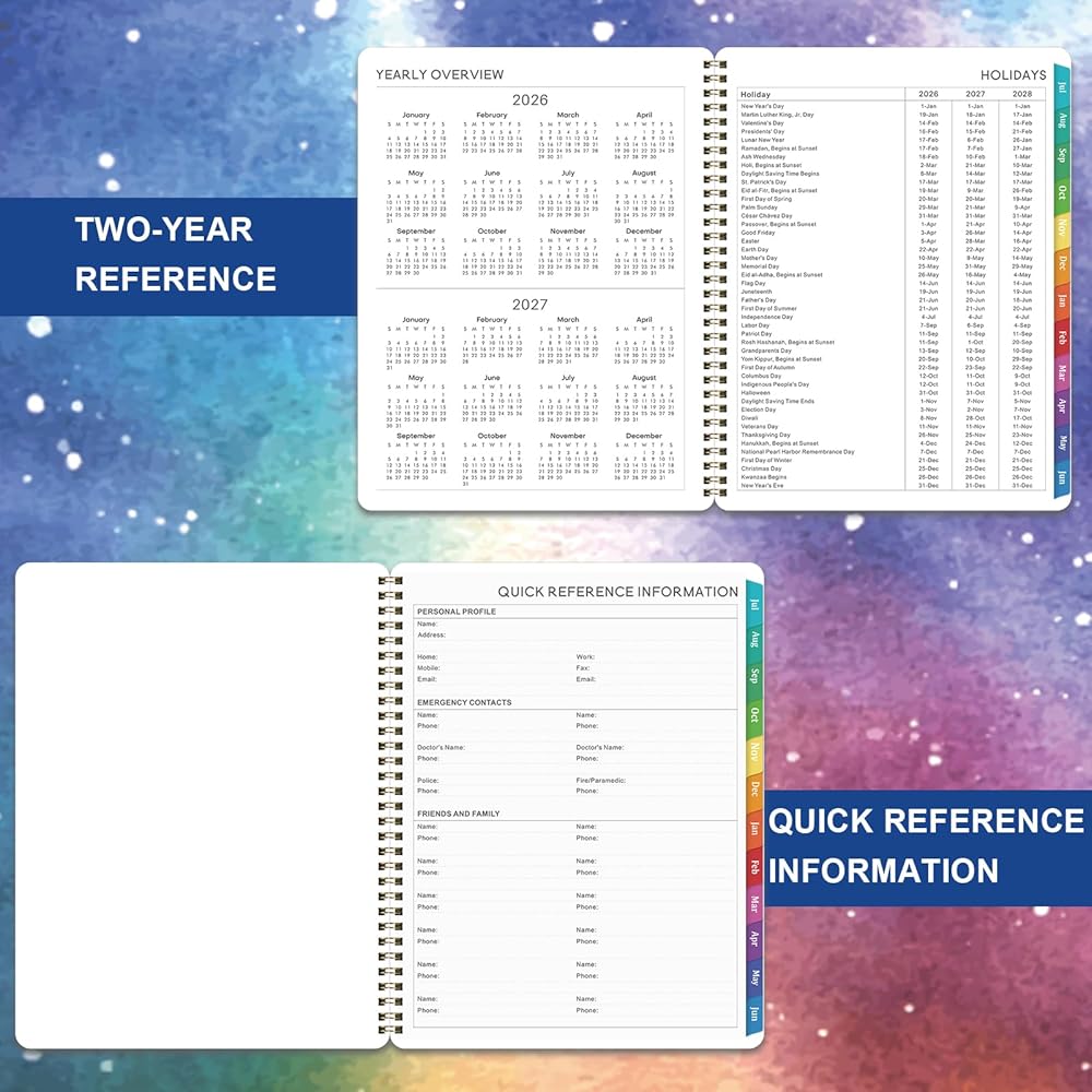 🌟 PREMIUM FUNCTIONAL DETAILS - This 2026-2027 calendar planner is built for durability and convenience: Hardcover design protects pages, thicker paper resists ink bleed, rounded corners prevent fraying, and strong twin-wire binding lies flat for easy writing. Also includes contacts pages, yearly overview, 2026-2028 calendar reference , Julian dates, and quick-reference info—all you need to stay organized!