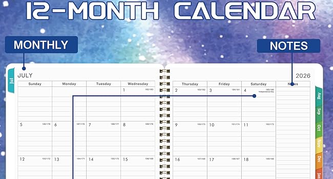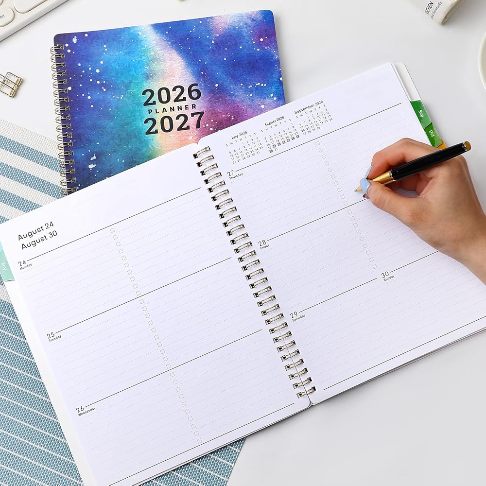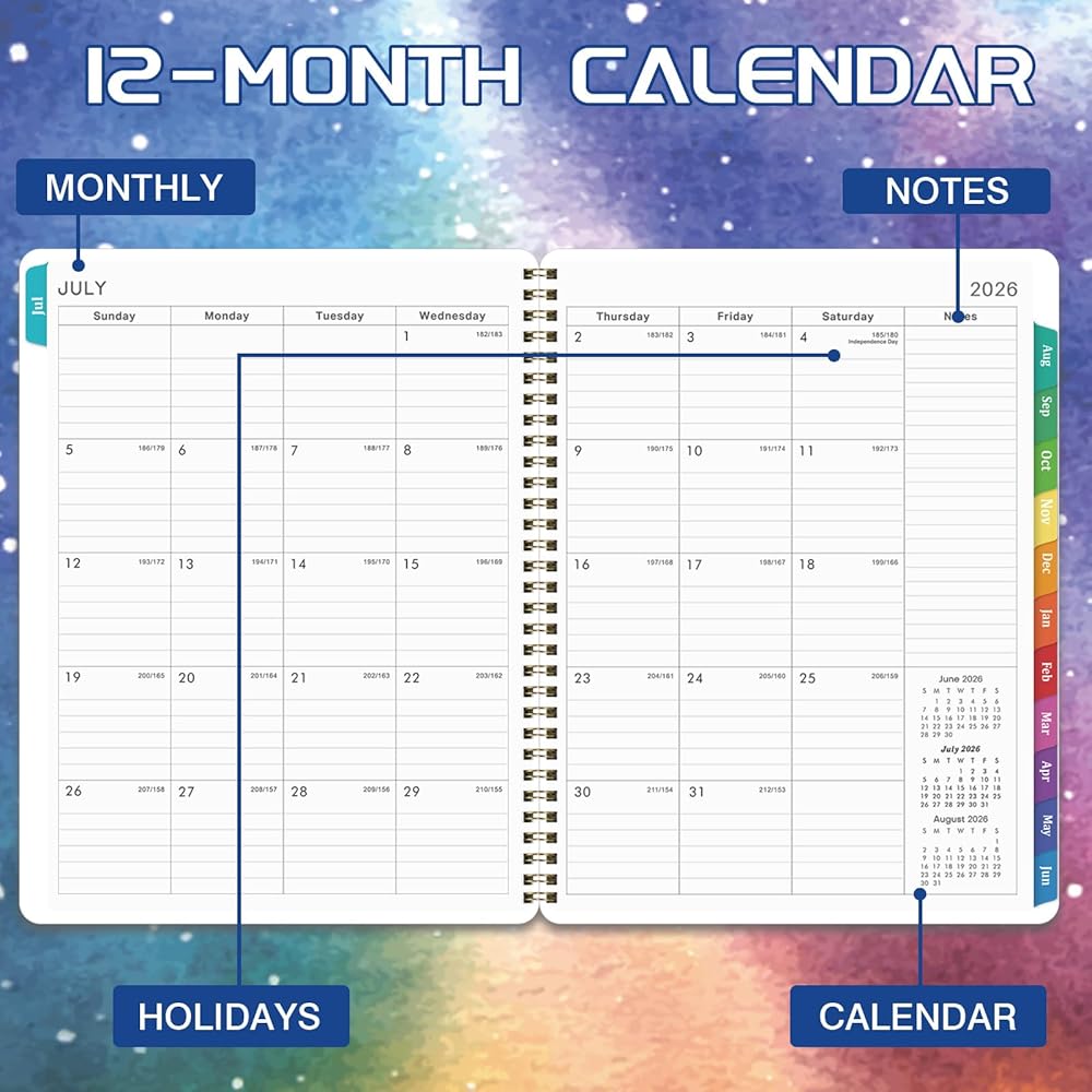 📝 2026-2027 WEEKLY PLANNING SPREADS - Every weekly page highlights a “Priorities” section for your top to-dos, plus generous lined space for appointments, events, and deadlines. Holidays are clearly marked to avoid misses, and the sleek gold twin-wire binding + 12 colorful monthly tabs make flipping to any date quick and easy.