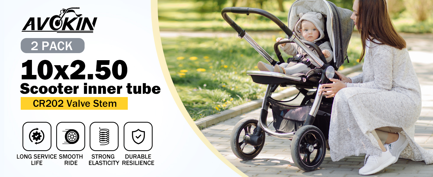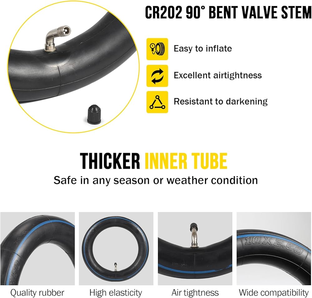 Superior Air Tightness:The thickened butyl rubber 10x2.5 inner tube boasts excellent air retention, effectively locking in tire pressure,reducing air leakage,eliminating the hassle of frequent inflation. Equipped with CR202 90° valve,it ensures easy inflation.