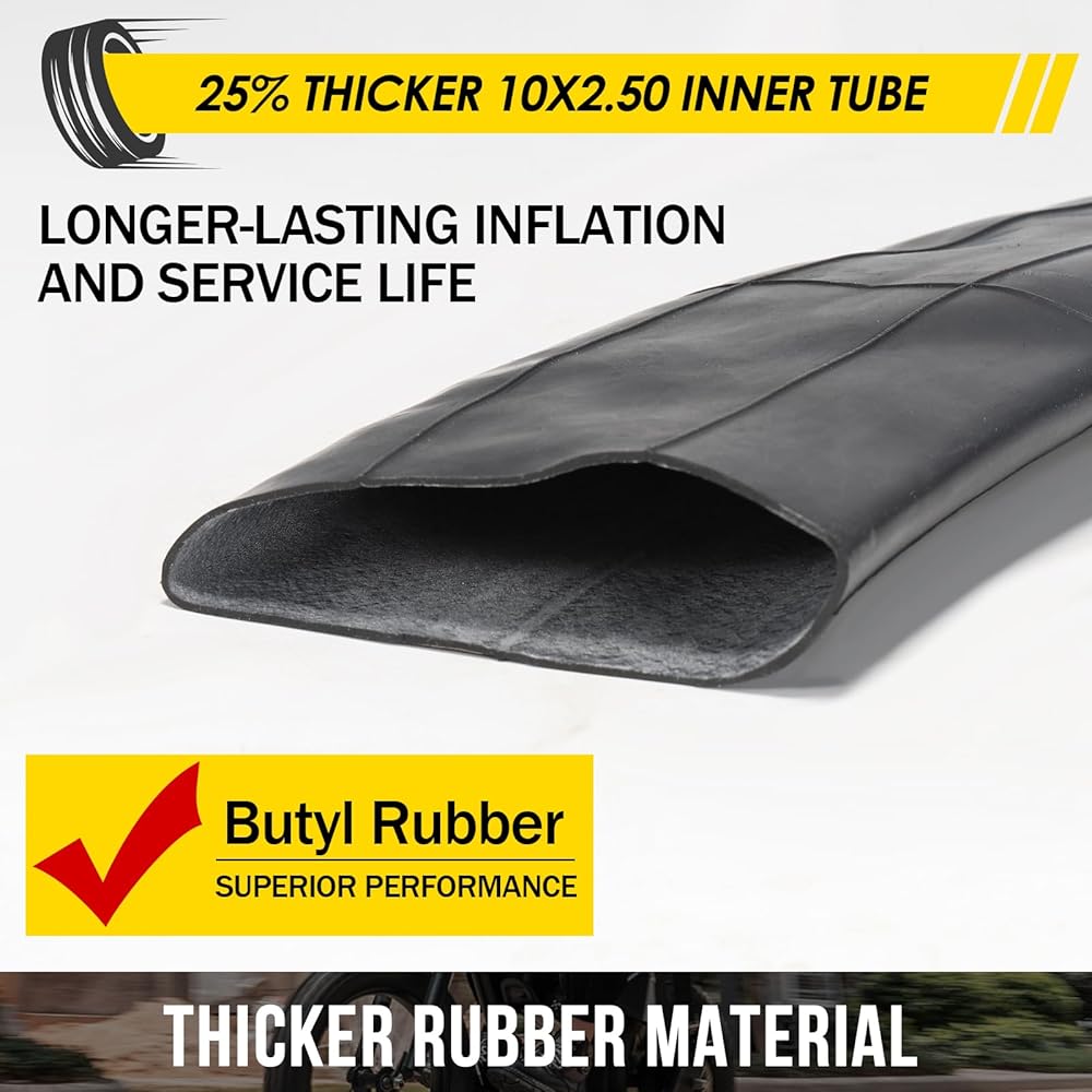 40% Thicker:Compared to ordinary inner tubes, 10x2.50 inner tubes are 40% thicker,150g in weight and 2mm in thickness (1.7mm of the original version). Therefore, it delivers better shock absorption and puncture resistance.