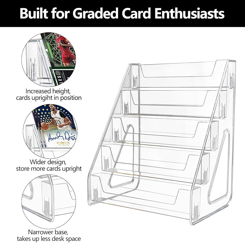 Elevate Your Display with Vertical Design: This taller, 5-tier acrylic stand showcases items with minimal overlap—perfect for greeting cards, sports cards, postcards, stickers, brochures, photos, and business cards. Its vertical layout ensures each item stands out elegantly.