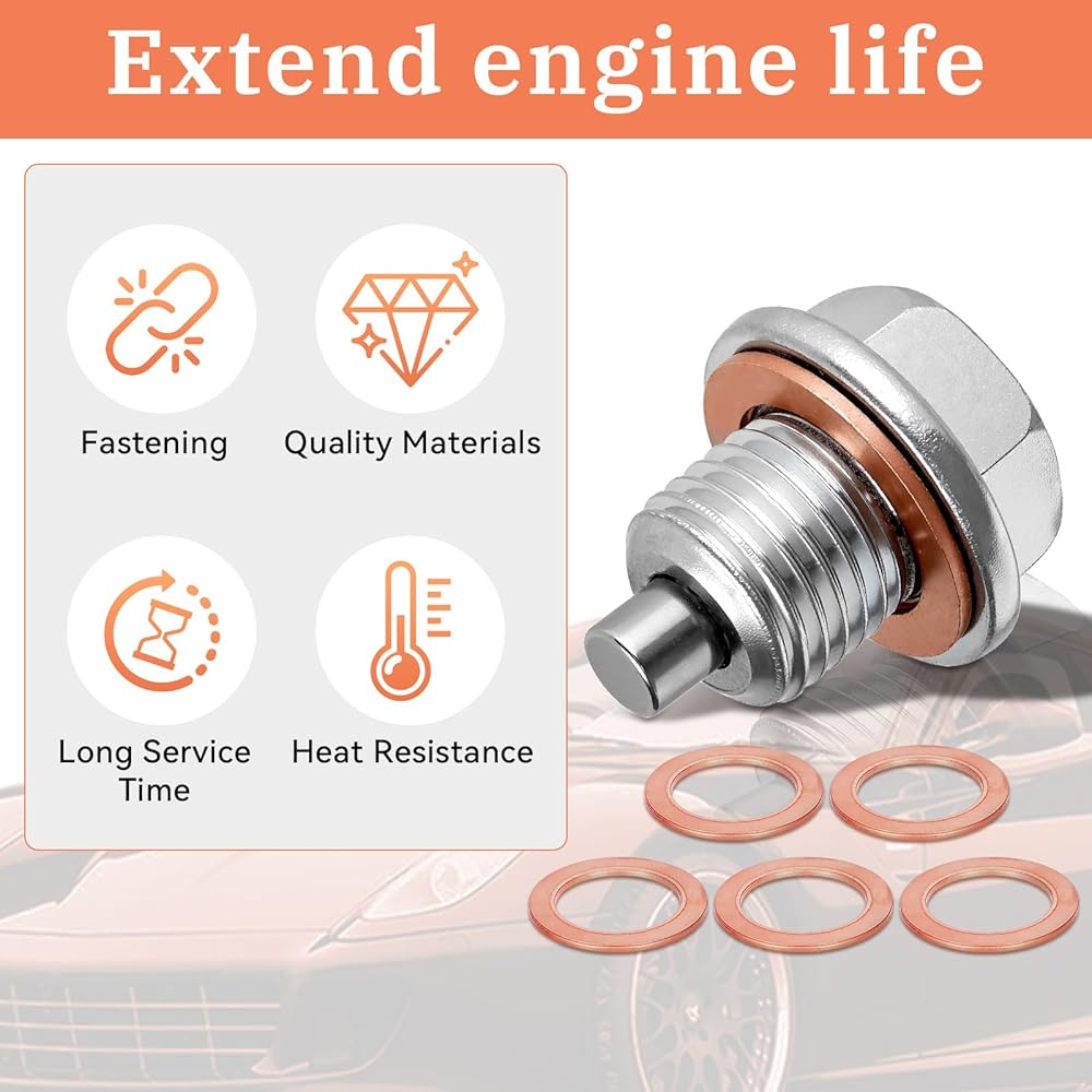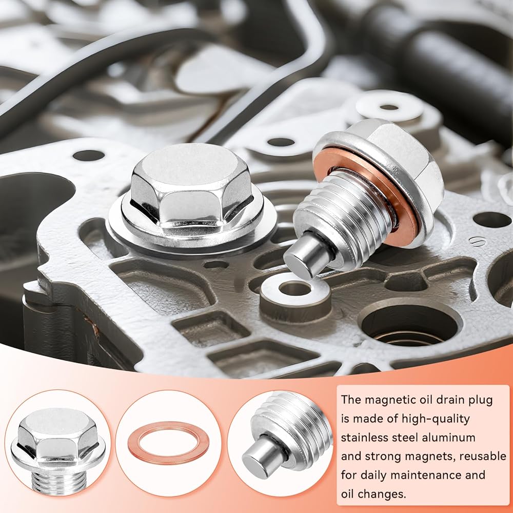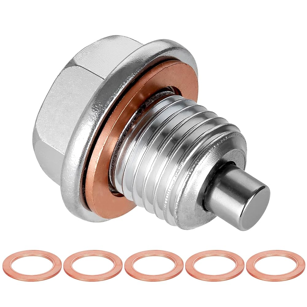 You will receive 1pc M14×1.5 stainless steel magnetic oil drain plug and 5pcs copper washers. Crafted from premium stainless steel and aluminum, the engine oil drain plug offers exceptional corrosion resistance, high pressure tolerance, and high temperature resistance. Its powerful magnetic core efficiently traps metal debris from engine wear, keeping the oil clean and extending engine lifespan. Paired with highly ductile copper washers, it ensures a tight seal to prevent oil leakage. It's easy to install as you simply replace the old bolt, reusable after wiping, and widely compatible with most cars, motorcycles, and small boats.