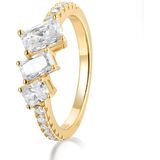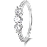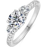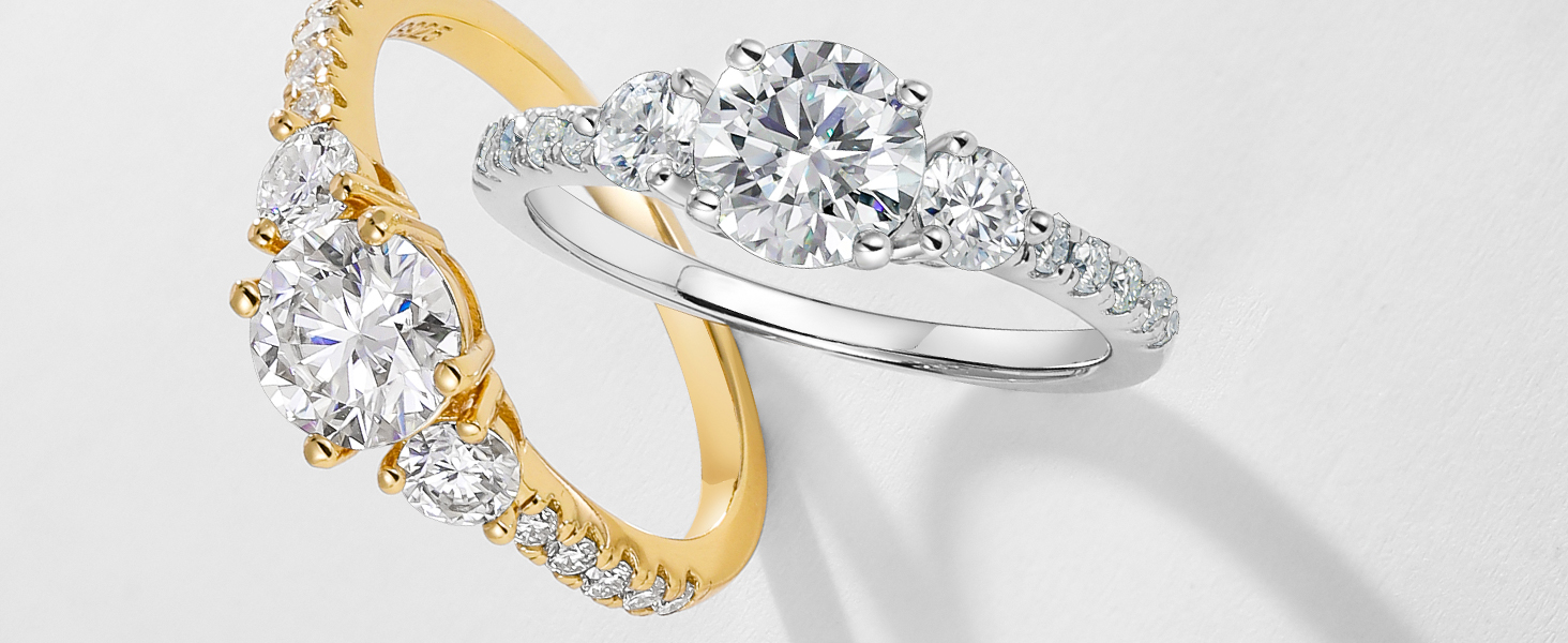 Striking 3-Stone Engagement Ring : Features a stunning center round-cut moissanite flanked by two smaller round-cut moissanite side stones, creating a classic and symmetrical look that symbolizes love, past, present, and future.