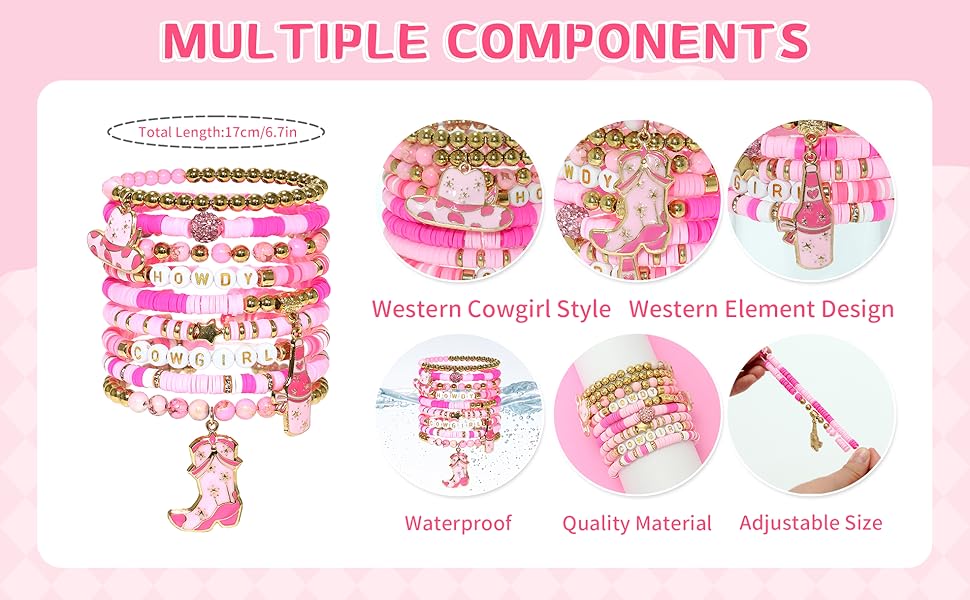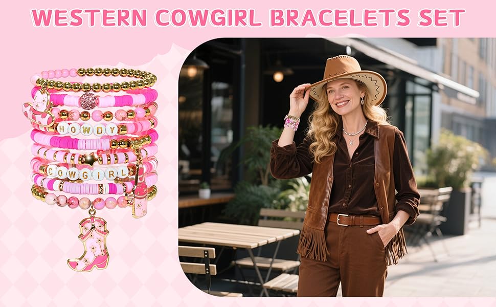 Western Cowgirl Bracelets Set: You will get 9 pieces of cow beaded stretch bracelets in a pack, paired with cowgirl themed charms, including hats and boots, add a touch of the wild west to your outfit