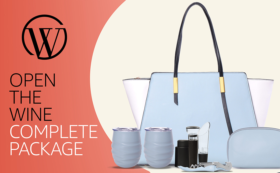Light Blue & White Wine Purse Gift Set - Accessories for Wine Lovers - Tote Bag Carrier with Tumblers, Aerator, Stopper, Corkscrew for Travel or Picnic