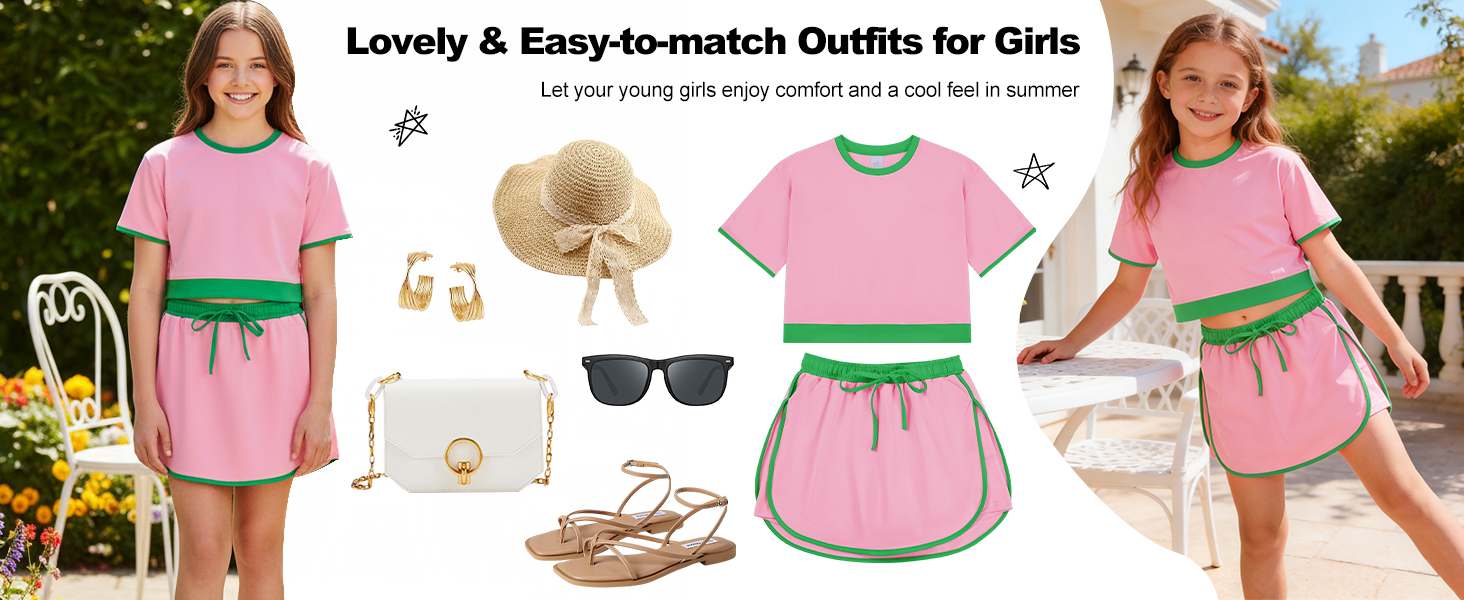 Keywords: Girls 2 Piece Summer Clothing Sets, Girls Short Sleeve T Shirt with Skort Set, Sports Short Set Girls, Summer Clothes Set for Girls, Girls Summer Short Set, Girls Skirt Set, Skort Set Girls