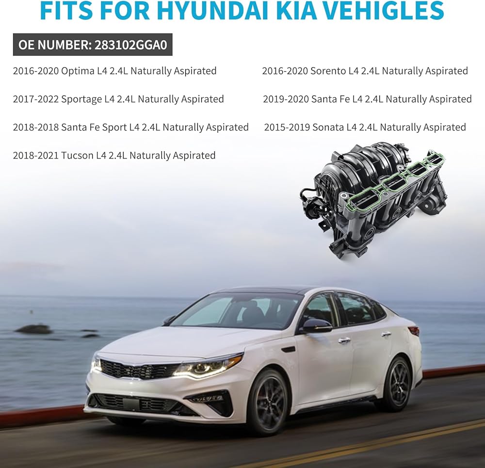 [Fitment]: Engine Intake Manifold Compatible With Hyundai Santa Fe 2019-2020 L4 2.4L, Santa Fe Sport 2018-2018 L4 2.4L, Sonata 2015-2019 L4 2.4L, Tucson 2018-2021 L4 2.4L; Compatible with Kia Optima 2016-2020 L4 2.4L, Sorento 2016-2020 L4 2.4L, fit for Sportage 2017-2022 L4 2.4L --- Only fit for L4 2.4L Engine [Replace OE Number]: 283102GGA0