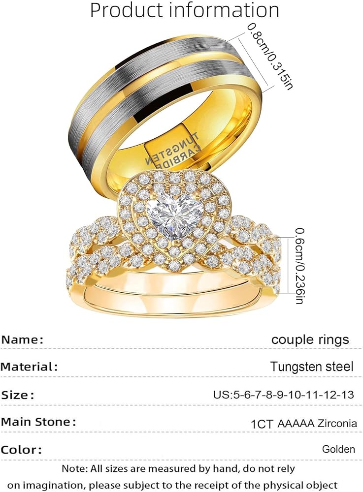 Material: Women's ring - 5A grade cubic zirconia with gold plating; Men's ring - tungsten steel with gold plating.