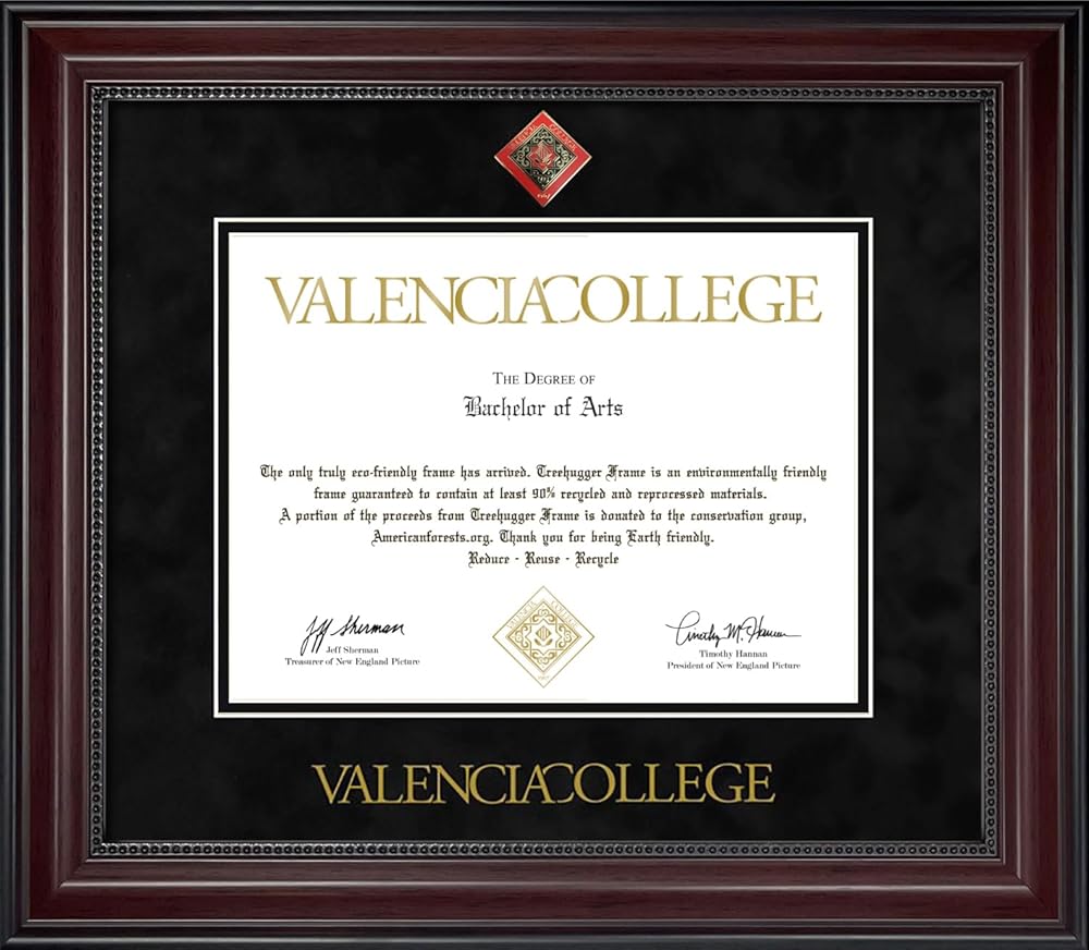 Valencia College Diploma Frame - Cherry Finish Wood with Bead Frame with Black Suede Mat. Color Medallion and Gold Embossed Seal