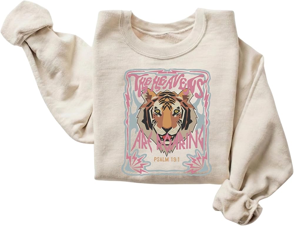 Bold faith meets fierce style in this “The Heavens Are Roaring” Psalm 19:1 sweatshirt. Featuring a striking tiger illustration framed with artistic detailing and vibrant pink typography, this design makes a powerful statement of strength, praise, and unwavering belief. Inspired by Psalm 19:1 — “The heavens declare the glory of God” — this sweatshirt symbolizes courage, confidence, and the beauty of creation. The combination of soft neutral fabric with eye-catching artwork creates a trendy yet meaningful piece perfect for everyday wear. Whether you're heading to church, a Bible study, youth group, or simply living your faith out loud, this crewneck allows you to express your spiritual strength in a bold and fashionable way.