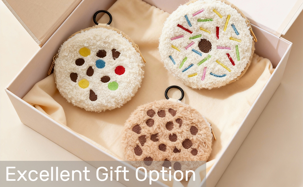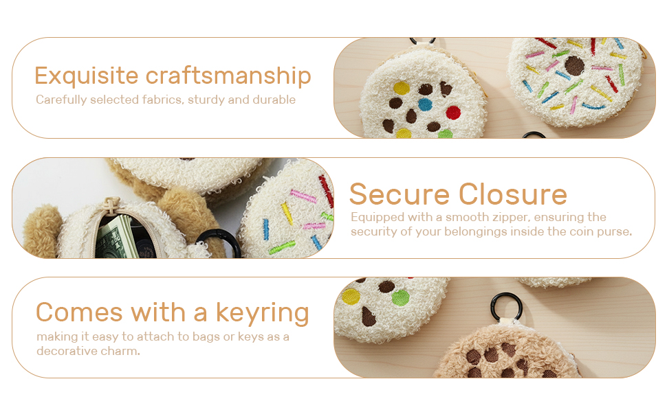 Charming and Functional Design: This plush dessert coin purse is both a practical accessory for storing coins and small bills, and a charming pendant. Available in delightful designs including colorful sugar cookie, chocolate cookie, and doughnut
