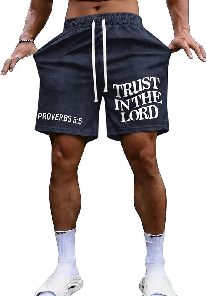 Features: christian shorts for men, acid wash shorts, mens cotton athletic shorts with pocket, bible trust in the lord letter graphic shorts, cool shorts for men, baggy gym sweat shorts, vintage mens religious shorts