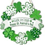 • Festive Shamrock Design:This St. Patrick's Day wooden wreath sign features layered shamrocks in vibrant green hues, with glitter and striped patterns for visual texture. The central ribbon displays “Luck of the Irish” and “Happy St. Patrick's Day” to capture the holiday's joyful, lucky spirit, making it an eye-catching focal point for any space.