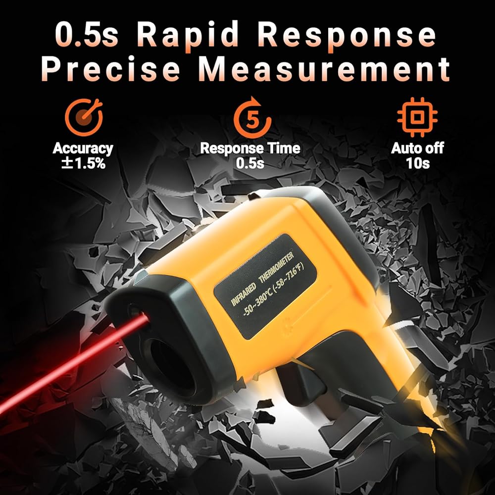📳𝐔𝐥𝐭𝐫𝐚-𝐅𝐚𝐬𝐭 𝐑𝐞𝐬𝐩𝐨𝐧𝐬𝐞: With its distance-to-spot ratio of 12:1 and a response time <500Ms, this infrared temp gun thermometer can quickly provide temperature readings of any target, even at great distances