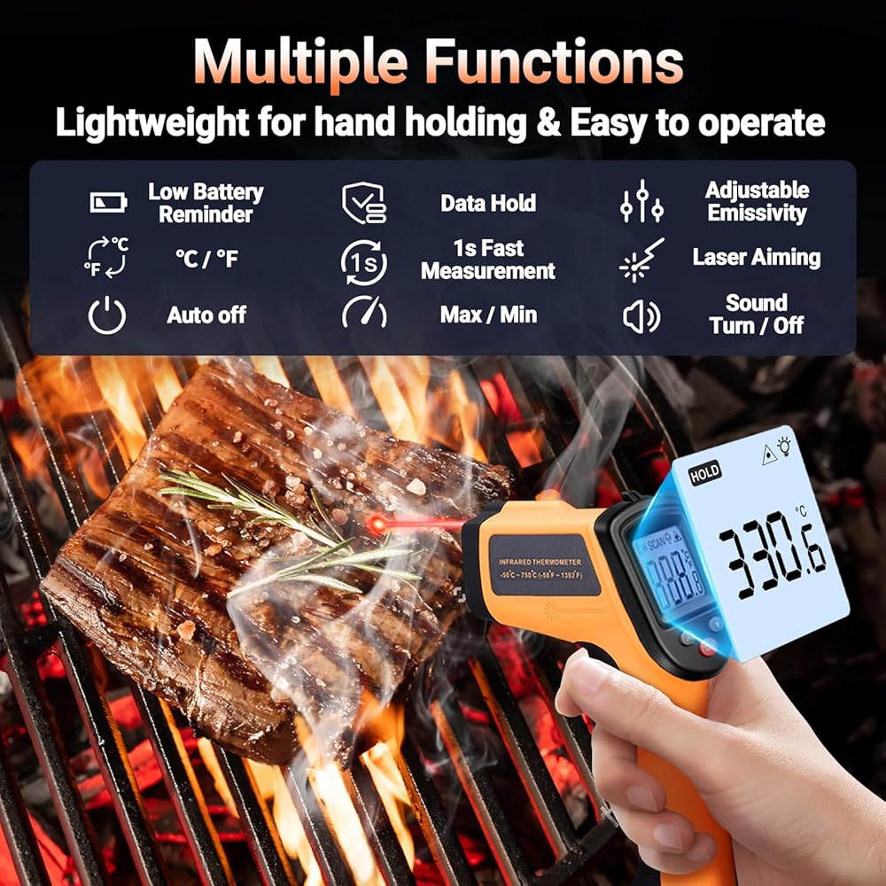 🍕𝐖𝐢𝐝𝐞 𝐓𝐞𝐦𝐩𝐞𝐫𝐚𝐭𝐮𝐫𝐞 𝐑𝐚𝐧𝐠𝐞: This infrared thermometer gun for cooking utilizes infrared technology to measure temperatures -58°F–1022°F (-50°C–550°C), enabling heat detector to measure surface temp from a safe distance, even above boiling point and below freezing point; This infrared thermometer temperature gun is perfect for food preparation, auto maintenance, home repairs, etc.