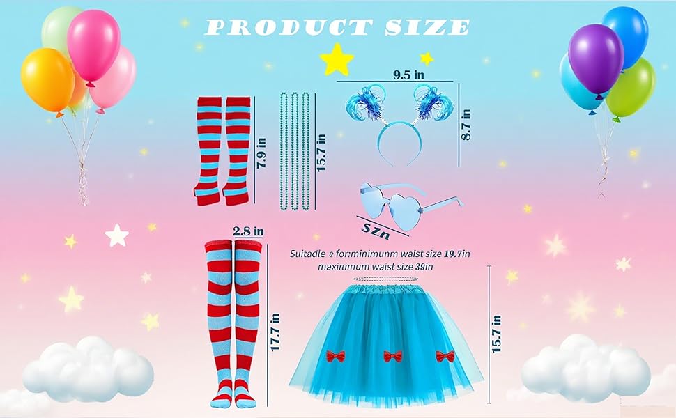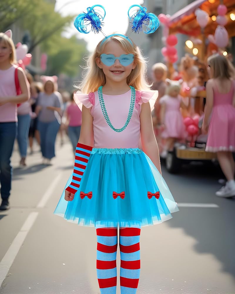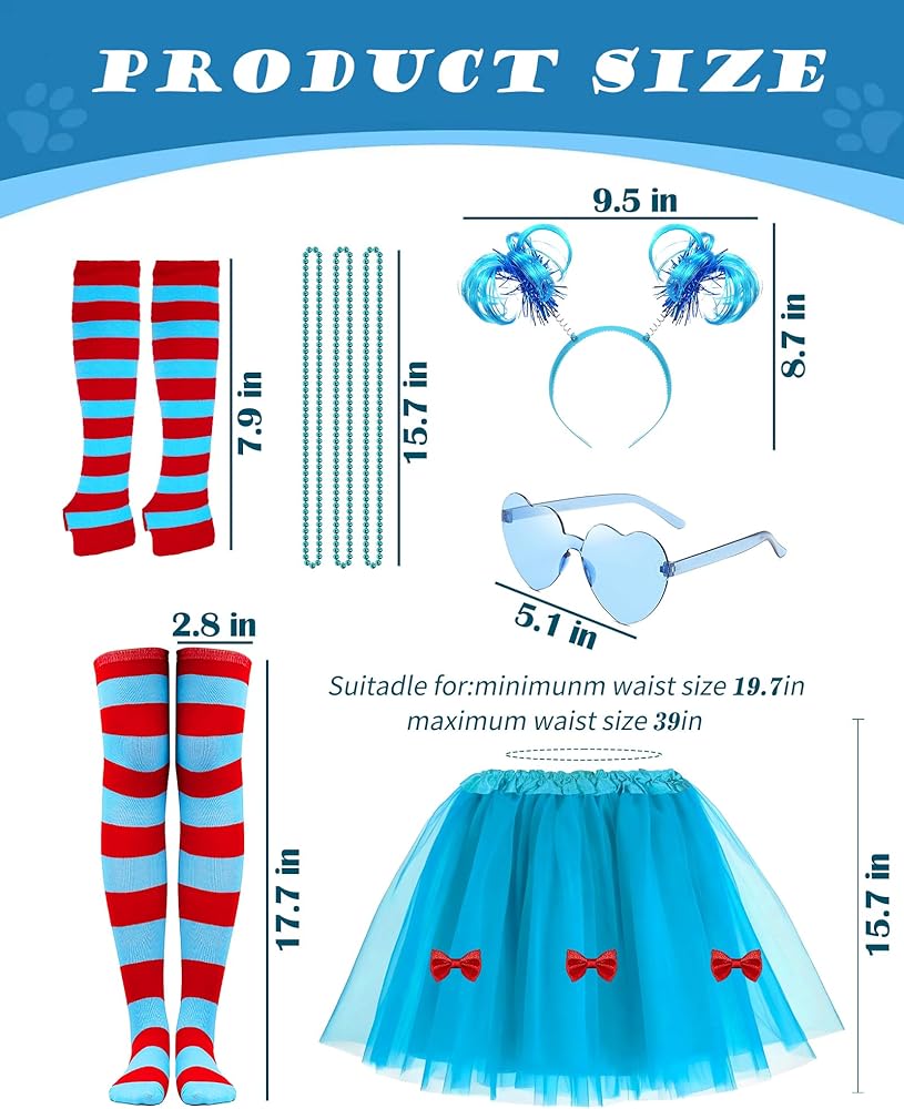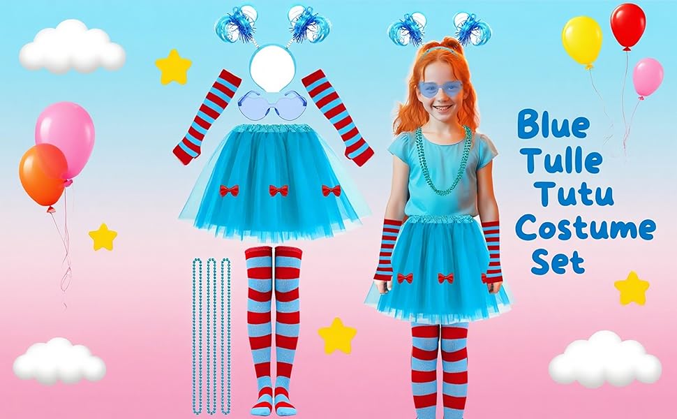 Blue Tulle Tutu Skirt Set: You will receive 1 piece of tutu skirt with butterfly,1 piece of ponytail headband, a pair of striped knee socks and gloves, 1 blue glasses, 3blue necklaces. The eye-catching Halloween outfits for girls ensures them stand out at any party or school event