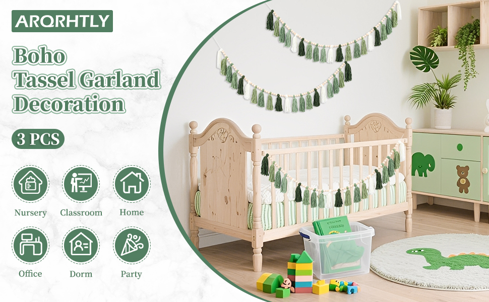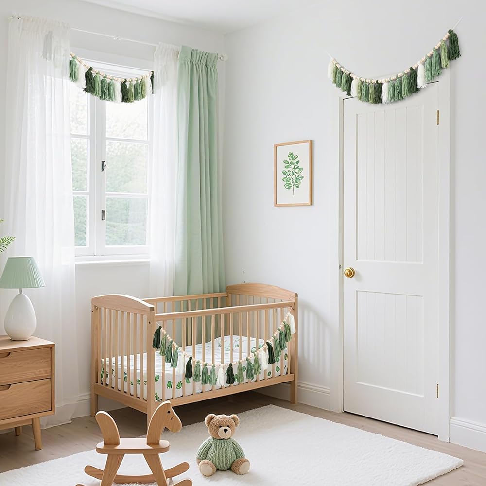 Boho Style Decor: Our Boho tassel garland decoration features 5 shades of sage green tassels with farmhouse style wooden beads in the center; It is an ideal choice for Boho, forest, jungle, neutral, simply style home, classroom, nursery, and party decor
