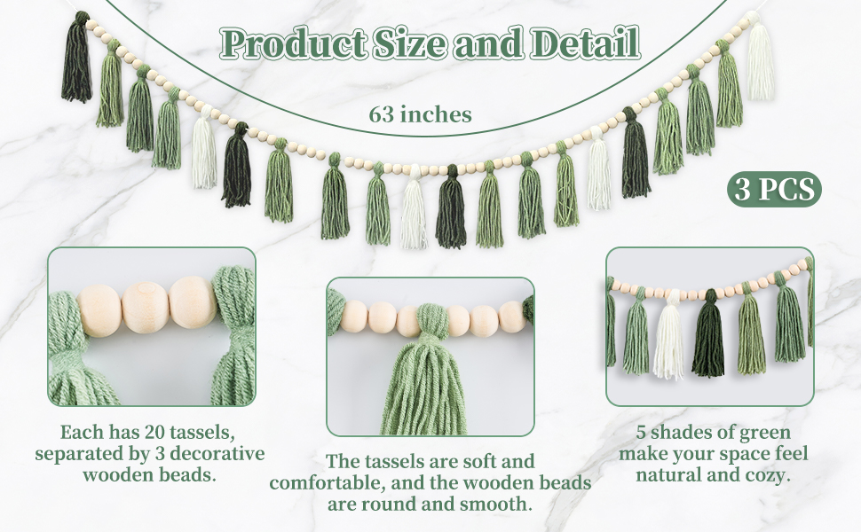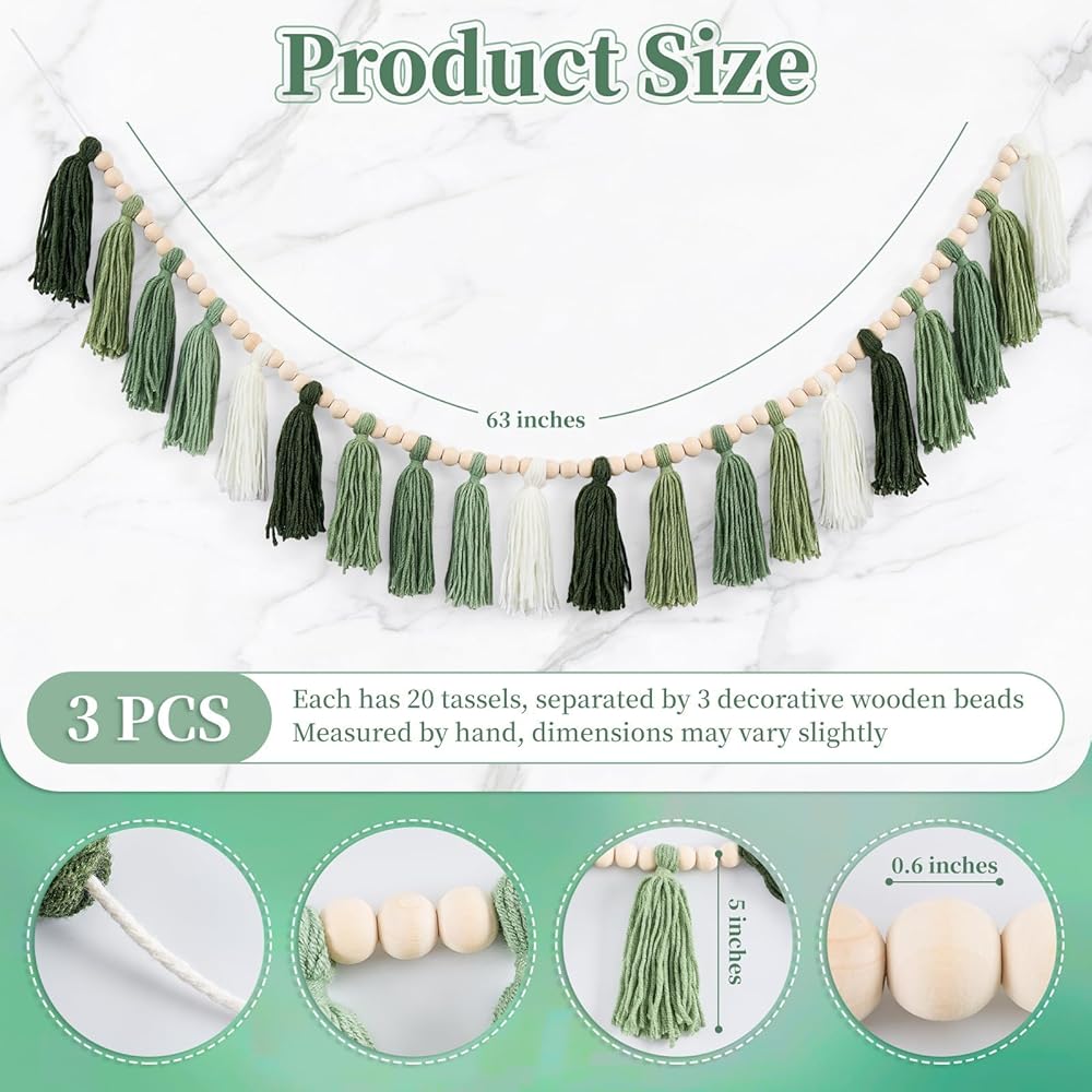 Packaging Includes: You will receive 3 gradient green Boho tassel garlands, easily meeting your decorating needs; Each tassel garland measures 63 inches in length (including the hanging rope), featuring 20 tassels, 5 inches each; Ideal for Boho room decor