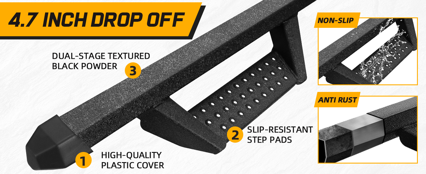 WIDE DROP STEP: Drop down style, 4.7 inch drop off making it easier to enter and exit. Durable non-slip steps provide more protection.