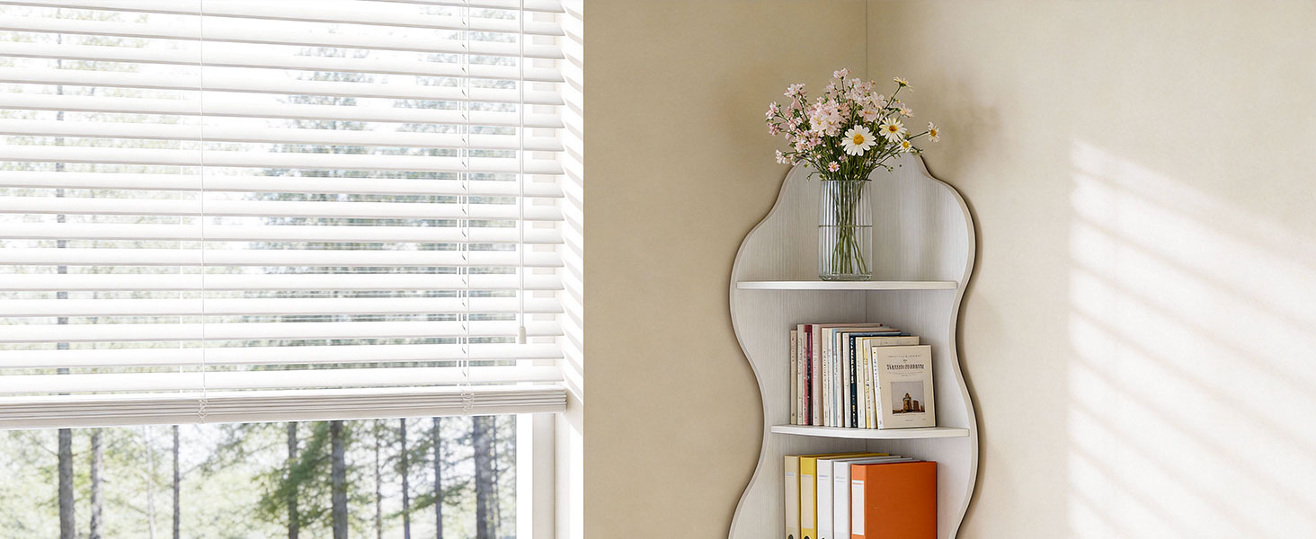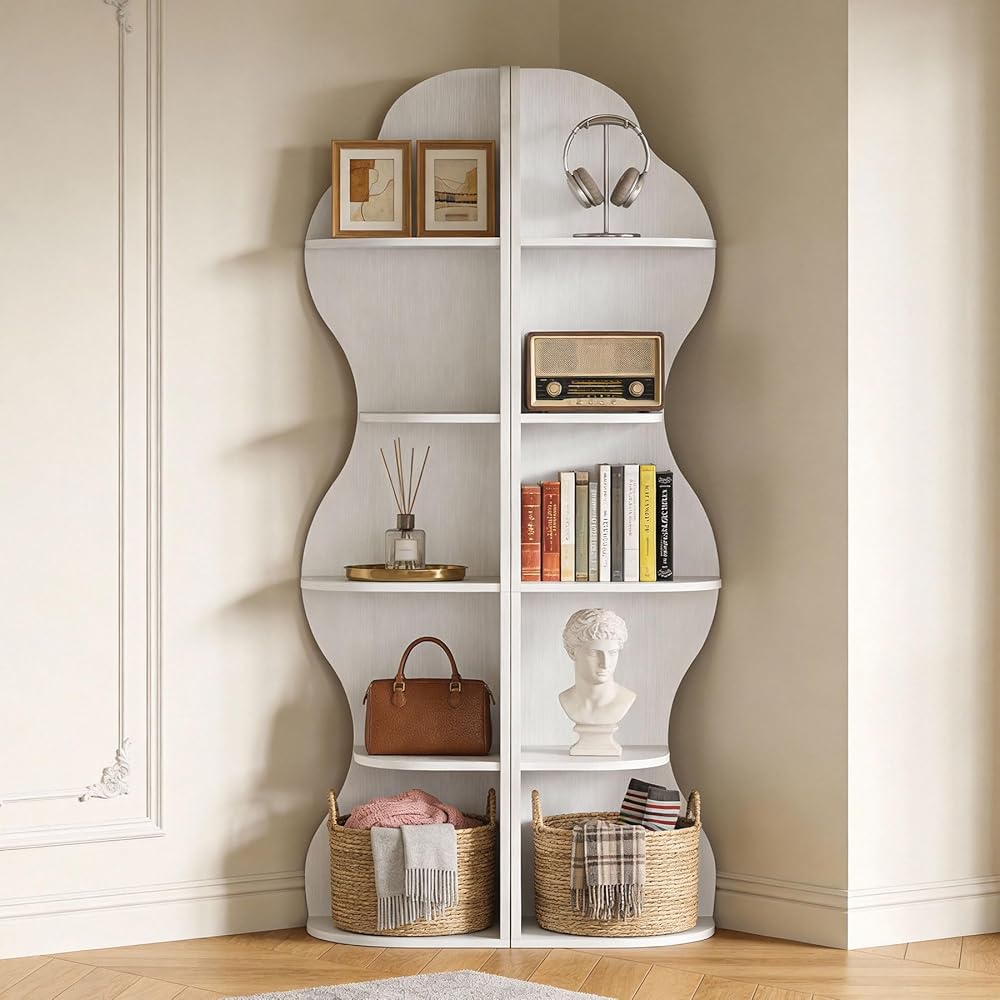 Curvy Corner Bookshelf: Drawing inspiration from the understated simplicity and natural beauty of seagrass, this corner shelf's wavy design stands out effortlessly, considerably enhancing the visual aesthetics of any room
