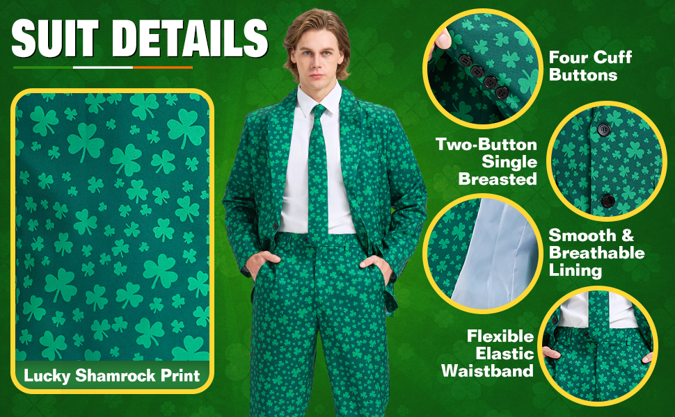 Unique Design: Celebrate St. Patrick's Day with standout style in this St Patricks day suit featuring a sharp button closure, notched lapel, and slim-fit cut that delivers a sleek, modern silhouette. The lively shamrock print adds playful character to the bold green base, creating a look that balances festive fun with tailored charm. Designed with attention to detail, this shamrock suit embodies the joyful energy of the holiday and lets you step out with confidence and personality