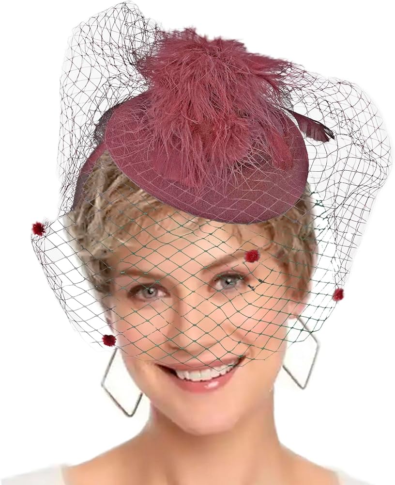 Fascinator hat for women: This sassy fascinator is vintage style with a bouncy mesh base organza ribbon and flight feathers. The mesh veil and elegant flower of the hat for women add glamour and fancy charm to your outfit. Trendy style matches everything.