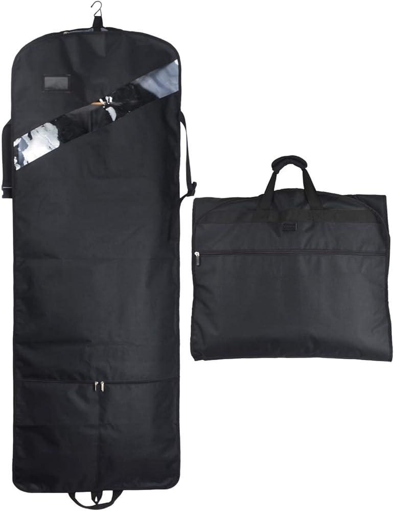 Foldable and flexible design for easy transporting and traveling with reinforced handles. 2 folds for storing or carrying & tri-folds for carry-on requirements, you don't have to struggle with the full length garment cover.