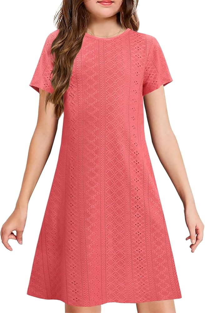 Girls short sleeve dress made from stretchy eyelet fabric, ensures comfort on hot summer days. Soft and breathable lining making it perfect for all-day wear. Girls dresses suitable for 6-13 years