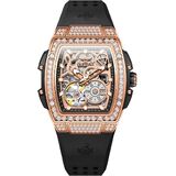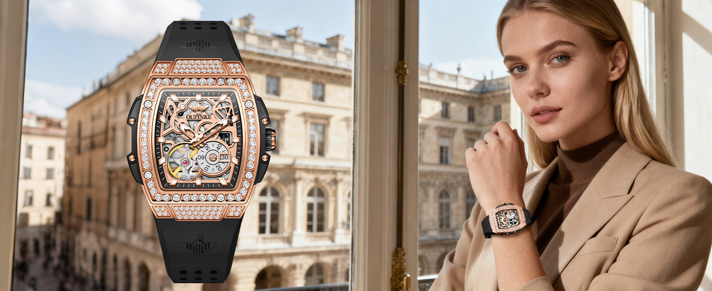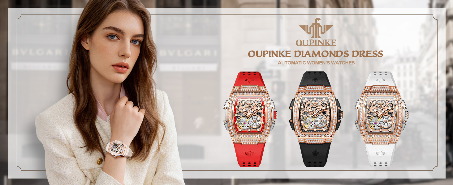 【OUPINKE Diamond Automatic Women's Watch】The entire dial is surrounded by dazzling diamonds. The square case is adorned with unique hollowed-out rose gold musical notes and gear decorations. The exquisite movement operates clearly, perfectly integrating high-end quality with mechanical aesthetics.