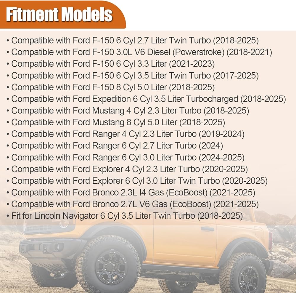【Compatible with Ford & Fit for Lincoln】Compatible with Ford F-150 2.7L (2018-2025), F-150 3.0L (2018-2021), F-150 3.3L (2021-2023), F-150 3.5L (2017-2025), F-150 5.0L (2018-2025), Expedition 3.5L (2018-2025), Mustang 2.3L (2018-2025), Mustang 5.0L (2018-2025), Ranger 2.3L (2019-2024), Ranger 2.7L (2024), Ranger 3.0L (2024-2025), Explorer 2.3L (2020-2025), Explorer 3.0L (2020-2025), Bronco 2.3L (2021-2025), Bronco 2.7L (2021-2025); Fit for Lincoln Navigator 3.5L (2018-2025).
