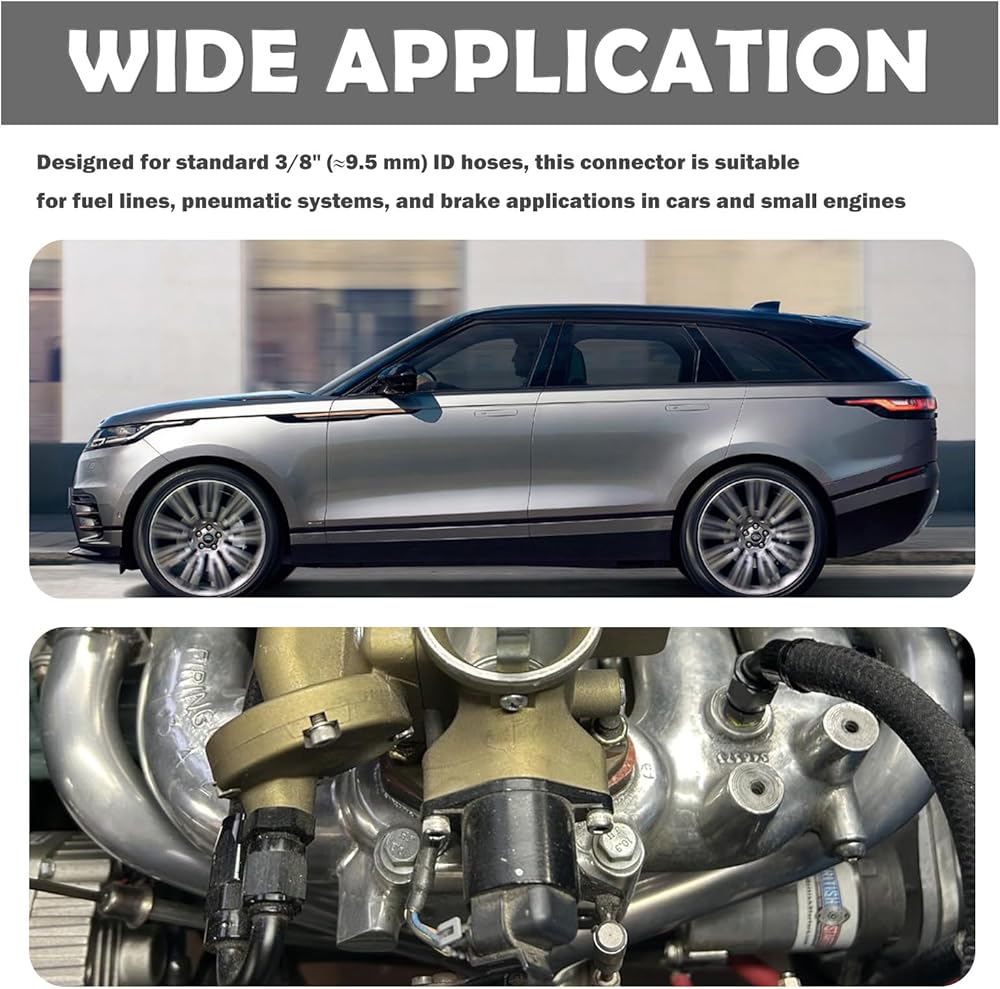 Wide Application: The fuel line connector is specifically designed for connecting standard 3/8-inch (approx. 9.5 mm) inner diameter hoses. It is widely applicable for fuel delivery lines, pneumatic circuits, and brake systems in automobiles and small engines