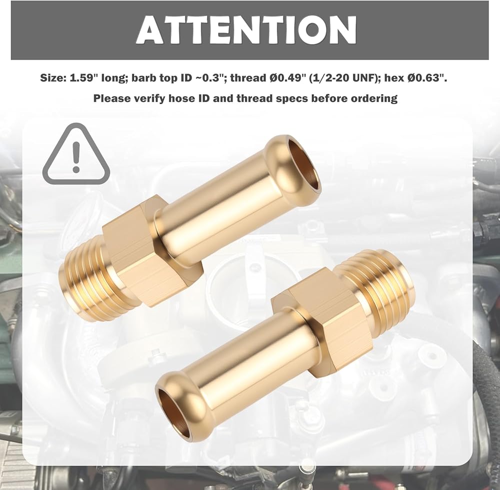 Precise Sizes: Fuel line fittings total length 1.59 inches, barb end top ID approx. 0.3 inches, thread diameter 0.49 inches, thread specification: 1/2-20 UNF, hexagon diameter 0.63 inches. Please carefully verify your hose inner diameter and thread specifications before ordering